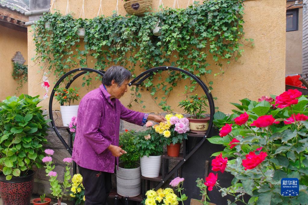 2020年8月30日,在河北省阜平縣駱駝灣村,村民唐宗秀在打理院子里的花草。新華社發(fā)(李玉亮 攝)