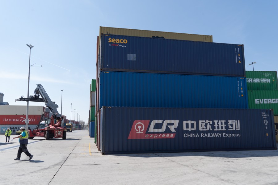 這是在匈牙利布達佩斯拍攝的切佩爾港物流園內的中歐班列集裝箱貨柜。(新華社發(fā),弗爾季·奧蒂洛攝)