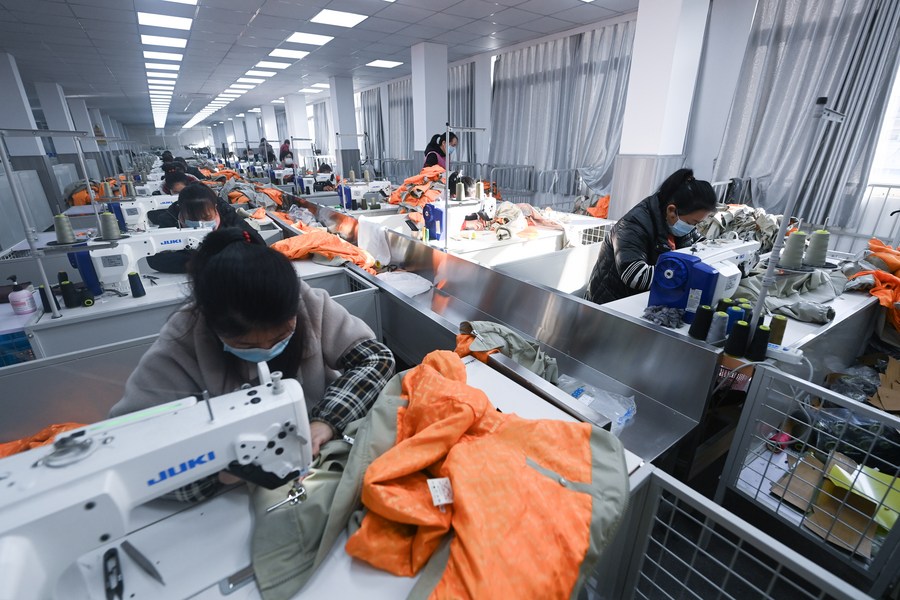在位于嘉興市南湖創(chuàng )業(yè)園的嘉興思凱服飾有限公司車(chē)間內,工人在加工外貿訂單。(新華社記者徐昱攝)