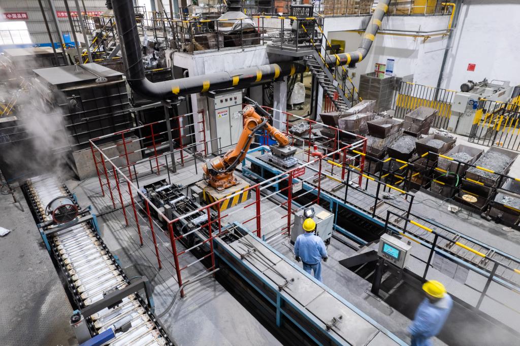 2月14日,在位于株洲市淥口經(jīng)開(kāi)區南洲工業(yè)園的湖南株冶火炬新材料有限公司,工作人員在生產(chǎn)鋅基合金產(chǎn)品(無(wú)人機照片)。新華社記者陳思汗 攝