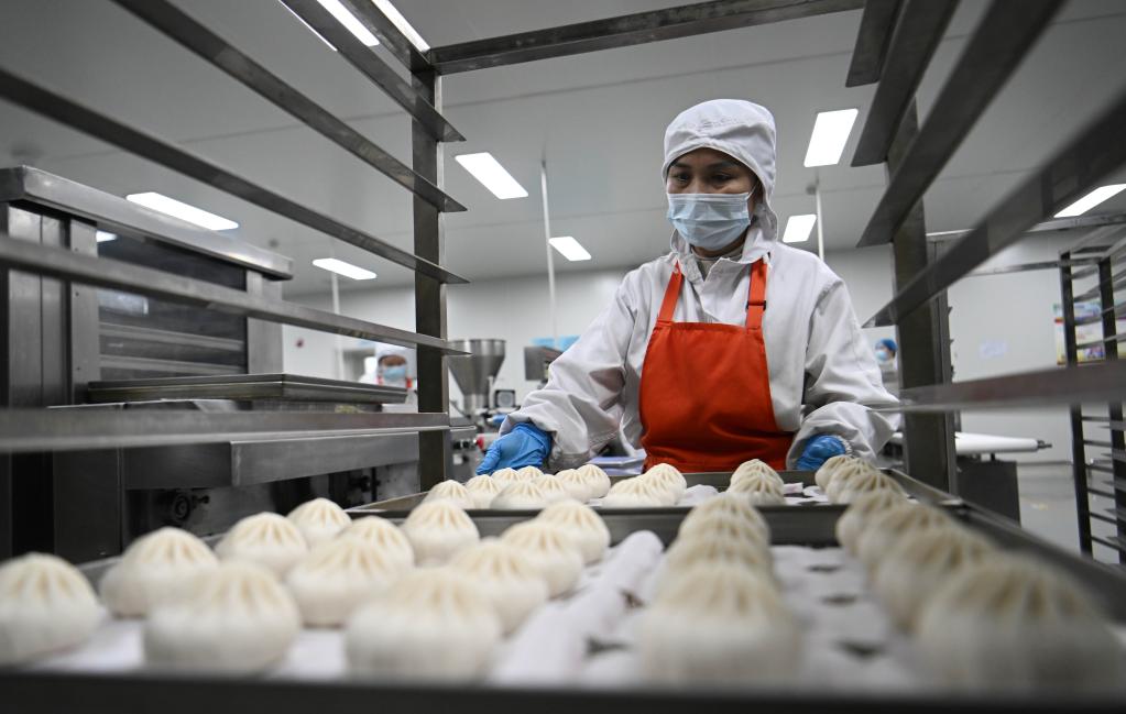 天津利達糧油有限公司速凍面食生產(chǎn)車(chē)間,工作人員在搬運速凍包子(2月23日攝)。新華社記者 趙子碩 攝