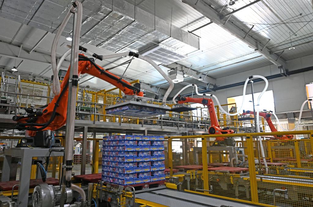 在天津海河乳品有限公司智能化生產(chǎn)線(xiàn),智能生產(chǎn)設備在轉運貨物(2月20日攝)。新華社記者 趙子碩 攝