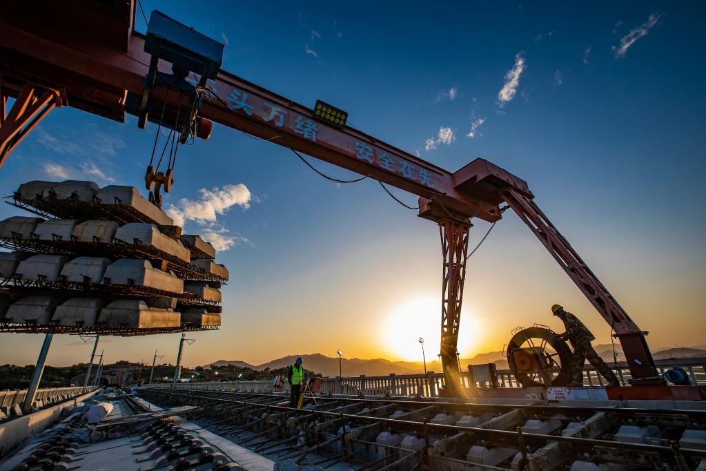 工人在新建福(州)廈(門(mén))鐵路湄洲灣跨海大橋施工(2022年4月8日攝)。(新華社記者周義攝)