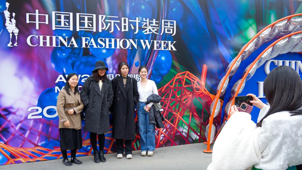 3月24日,觀(guān)眾在2023秋冬中國國際時(shí)裝周展板前拍照留念。新華社記者魏弘毅 攝