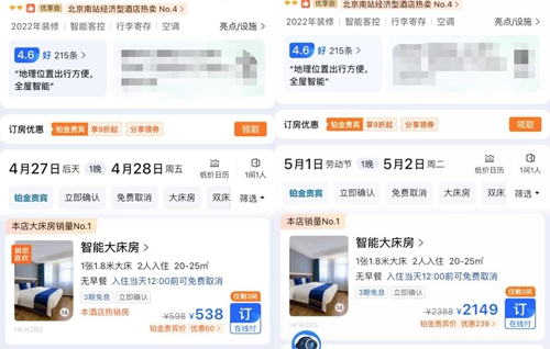 而這一輪漲價(jià)潮中,經(jīng)濟型酒店的房?jì)r(jià)漲幅尤其突出。位于北京珠市口地鐵站旁的一家經(jīng)濟型酒店,智能大床房平日售價(jià)在500元左右,4月29日入住為1699元,5月1日則漲到2149元。