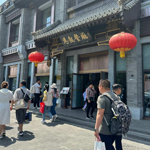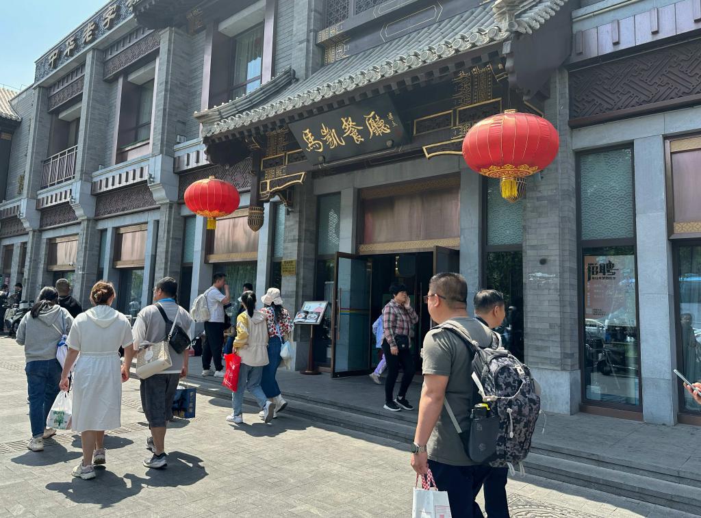 上午10點(diǎn)半,地安門(mén)外大街上已是人流熙攘,鼓樓紅墻前不少游客在拍照“打卡”,煙袋斜街內不時(shí)傳來(lái)歡聲笑語(yǔ)。馬凱餐廳外大紅燈籠隨風(fēng)搖曳,中午開(kāi)餐時(shí)間剛過(guò),就有顧客陸續進(jìn)入。