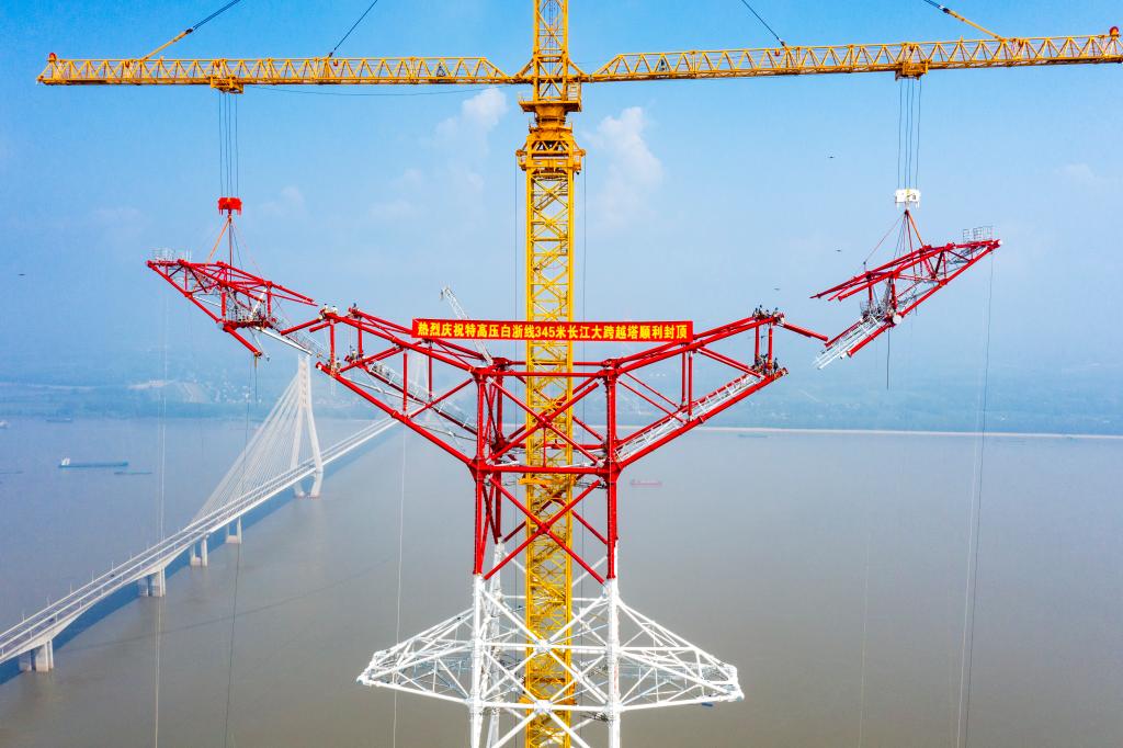 2022年8月1日,安徽送變電工程有限公司施工人員在池州長(cháng)江大跨越南岸跨越塔封頂施工現場(chǎng)作業(yè)(無(wú)人機照片)。