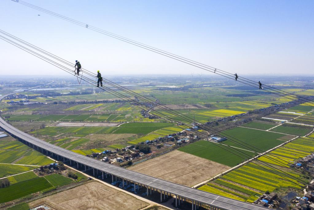 2022年3月10日,安徽送變電工程有限公司檢修工人在高空巡檢(無(wú)人機照片)。
