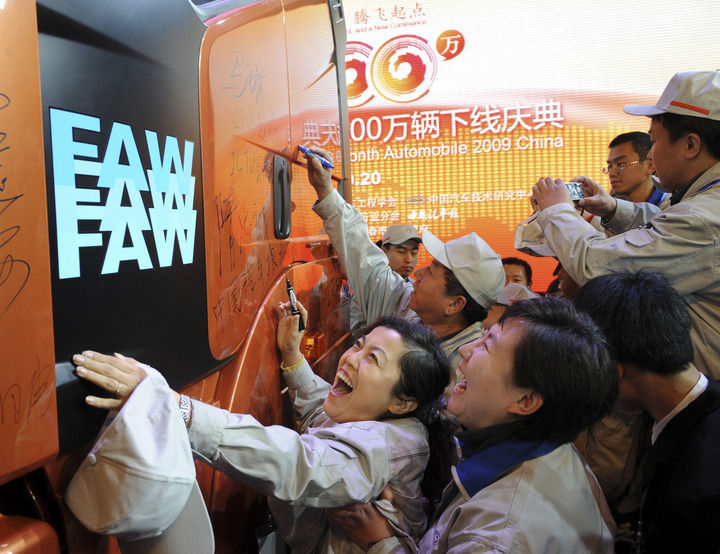 2009年10月20日,一汽解放的工人們在自己親手生產(chǎn)的2009年中國第1000萬(wàn)輛車(chē)上簽名。新華社記者 蔣林 攝