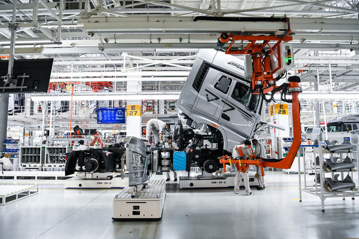 在位于吉林長(cháng)春的一汽解放汽車(chē)有限公司J7智能工廠(chǎng)內,工人在A(yíng)GV(搬運機器人)上裝配車(chē)輛(2023年6月12日攝)。新華社記者 顏麟蘊 攝