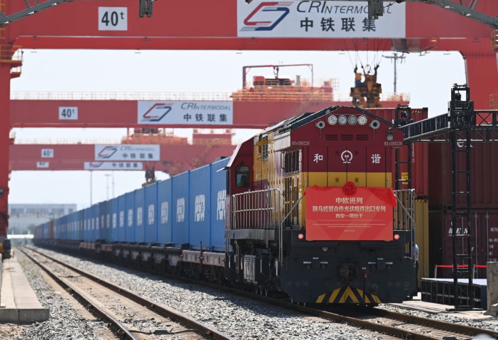2023年8月3日,中歐班列(西安-塔什干)陜?yōu)踅?jīng)貿合作隆基綠能光伏組件出口專(zhuān)列在西安國際港站準備發(fā)車(chē)。新華社記者 鄒競一 攝