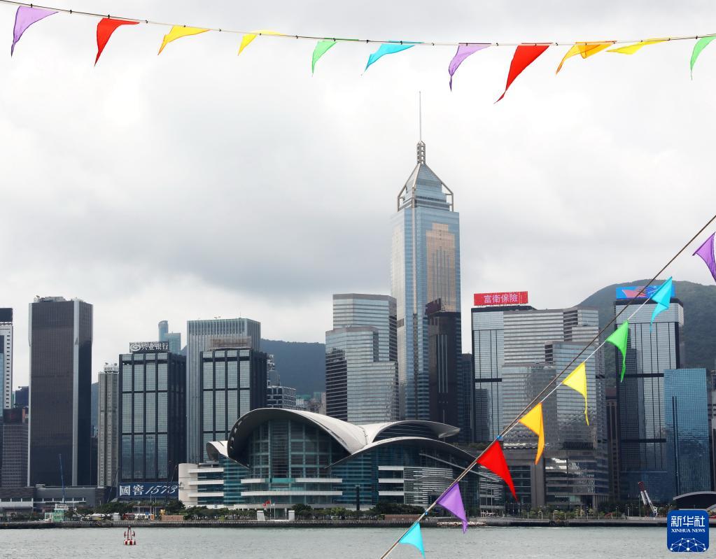 在香港尖沙咀,中華人民共和國國旗和香港特別行政區區旗一起迎風(fēng)飄揚( 6月29日攝)。新華社記者 李鋼 攝