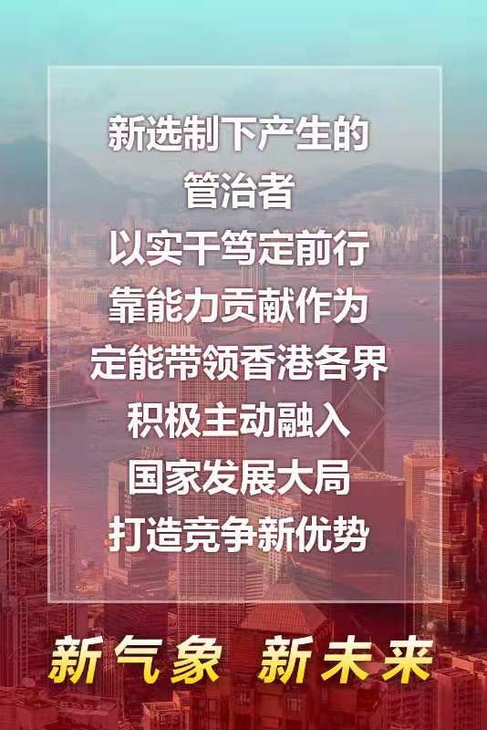 “惟希望也,故進(jìn)??;惟進(jìn)取也,故日新?!蔽覀兿嘈?,新選制下產(chǎn)生的管治者,必將以實(shí)干篤定前行,靠能力貢獻作為,定能帶領(lǐng)香港各界積極主動(dòng)融入國家發(fā)展大局,打造競爭新優(yōu)勢。我們堅信,有偉大祖國作堅強后盾,有14億多中國人民全力支持,全體香港同胞團結一致、不懈奮斗,“一國兩制”在港實(shí)踐必將煥發(fā)新的生機和活力,香港定能再創(chuàng )新猷,大有可為!