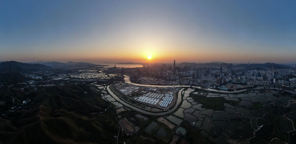 4月3日,夕陽(yáng)下的落馬洲河套地區,中央援港應急醫院如一葉方舟。