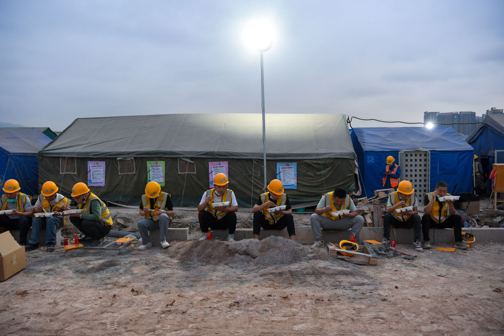 4月18日傍晚,工人們坐在帳篷外吃盒飯。