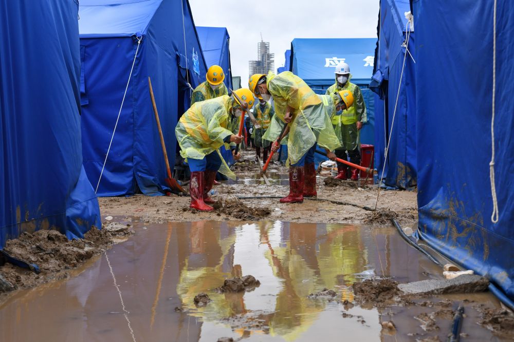 3月23日,一場(chǎng)大雨過(guò)后,泥水漫灌進(jìn)生活區的帳篷,工人們動(dòng)手挖排水渠。