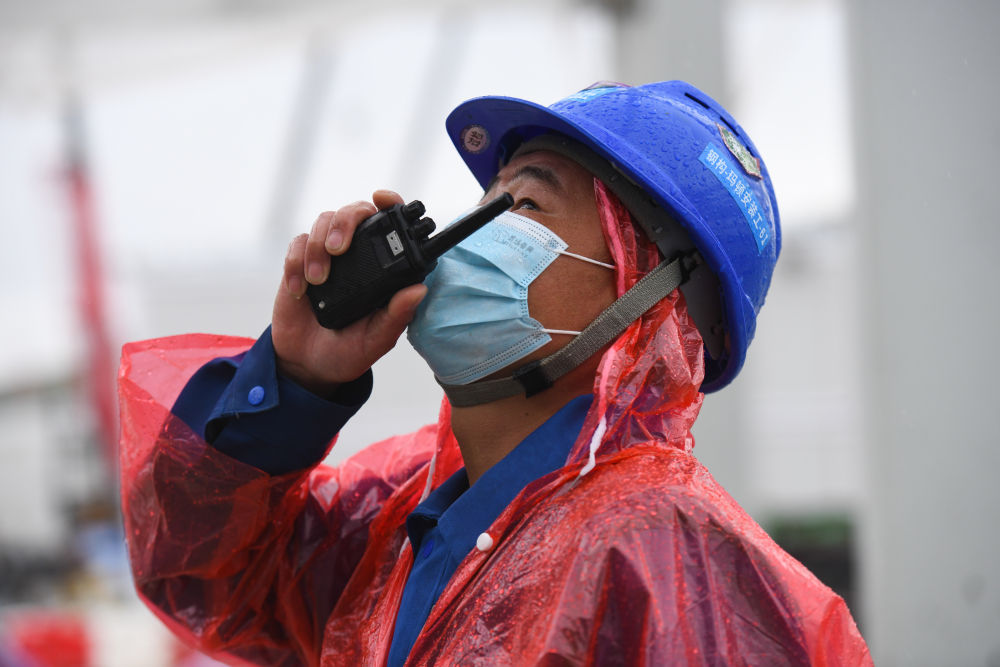 4月2日,工人們冒雨協(xié)力奮戰。