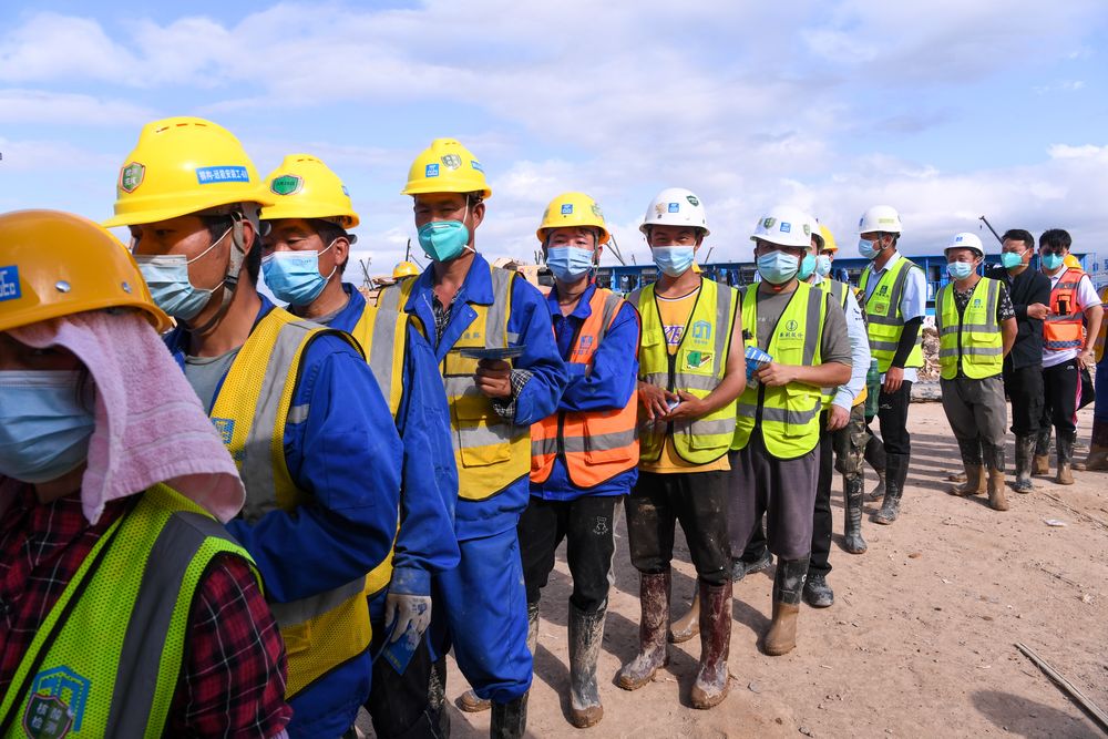 轉而連降暴雨,氣溫急轉直下,雨水和黃土和成泥漿灌進(jìn)工人生活區的帳篷,行軍床和被褥漂在泥水里,但為了搶工期,建設者們仍在雨中夜以繼日奮戰。