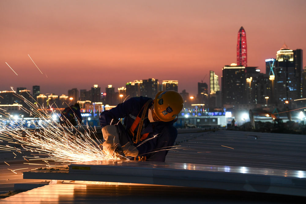 4月8日傍晚,一名工人在應急醫院屋頂施工,他的身后是深圳萬(wàn)家燈火。