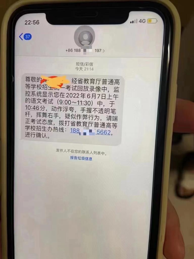 “尊敬的考生×××,經(jīng)省教育廳普通高等學(xué)校招生統一考試回放錄像中,監控系統顯示您在2022年6月7日上午的語(yǔ)文考試(9:00—11:30)中,于10時(shí)46分,動(dòng)作浮夸,手握不透明筆桿,揮舞右手,疑似作弊行為,請端正考試態(tài)度,撥打省教育廳普通高等學(xué)校招生辦熱線(xiàn):188×××進(jìn)行確認?!苯?,有考生向廈門(mén)警方反映,自己接到了聲稱(chēng)是“省教育廳普通高等學(xué)校招生辦”的通知短信,懷疑是詐騙信息。該短信在開(kāi)頭準確寫(xiě)明了考生姓名,并在結尾要求考生主動(dòng)撥電話(huà)號碼進(jìn)行確認。經(jīng)與教育部門(mén)核實(shí)確認,高考作弊違規行為不會(huì )以短信、電話(huà)、鏈接等方式通知。廈門(mén)警方提醒,不法分子通過(guò)非正常渠道搜集到考生信息,并向考生發(fā)送所謂“疑似作弊”的通知短信,考生一旦回撥電話(huà),就可能被不法分子以“處理作弊行為”為由實(shí)施詐騙。