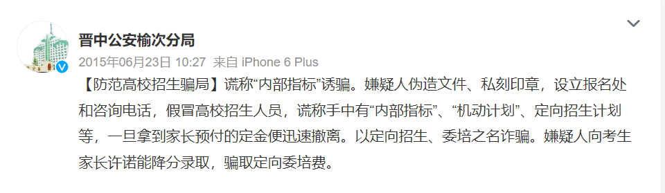 每年各省市投檔分數線(xiàn)公布后,總是“幾家歡喜幾家愁”,不法分子也在此刻瞄準了落榜考生。根據各地公安部門(mén)通報,一些不法分子假冒高校招生人員或聲稱(chēng)“熟悉”高校招生辦,點(diǎn)對點(diǎn)與相關(guān)考生取得聯(lián)系。隨后謊稱(chēng)有某高校的“內部指標”“機動(dòng)計劃”,或是以“定向招生”“委培招生”等名義“降分錄取”考生,誘騙其繳納相關(guān)費用。需要注意的是,在實(shí)施這些詐騙行為時(shí),不法分子往往使用電腦合成技術(shù)偽造“招生文件”“學(xué)校公章”等,騙取考生及家長(cháng)的信任。