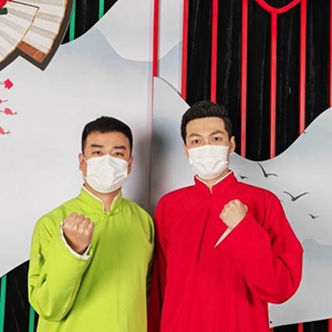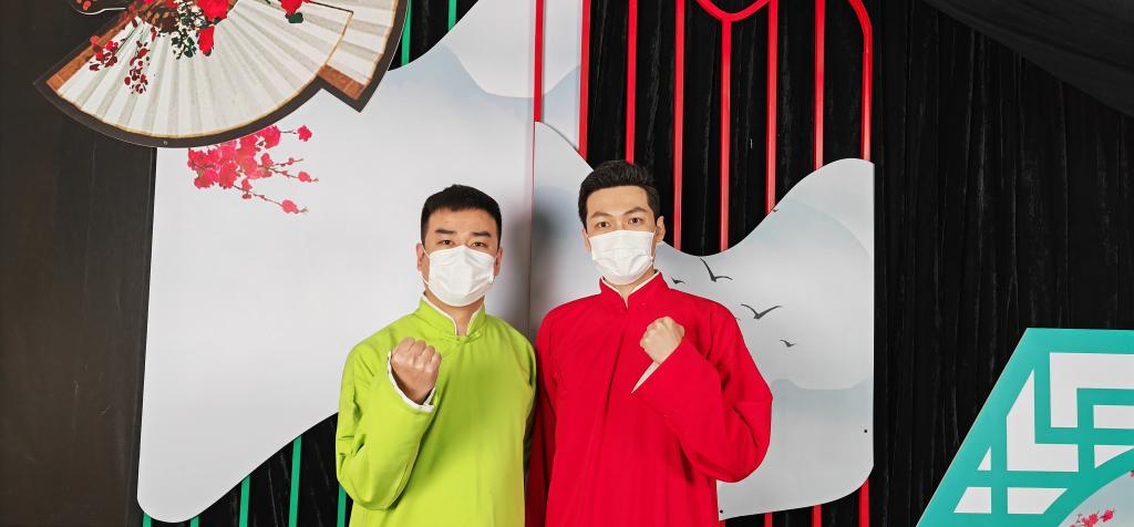天津人民藝術(shù)劇院演員劉紀銘(左)、萬(wàn)毅夫在錄制快板短視頻。(天津北方演藝集團供圖)