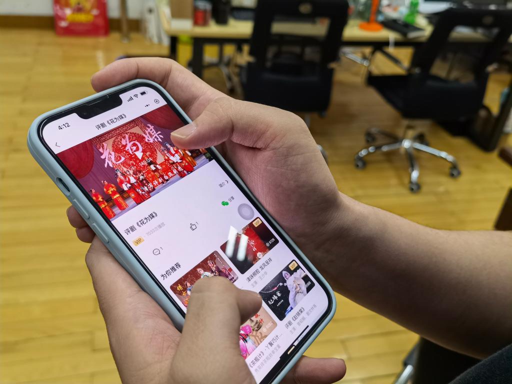 一位市民用手機上的微信小程序“小北劇場(chǎng)”觀(guān)看評劇《花為媒》。(天津北方演藝集團供圖)