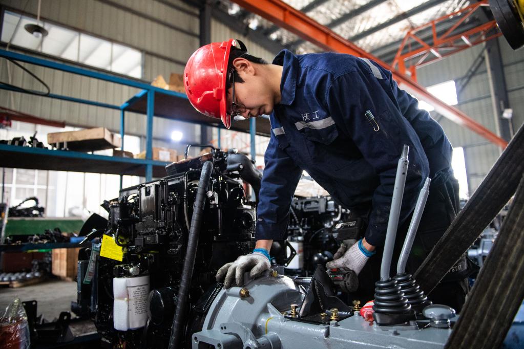 2月26日,在益陽(yáng)富佳科技有限公司,楊建斌在組裝農機動(dòng)力系統。新華社記者陳思汗 攝