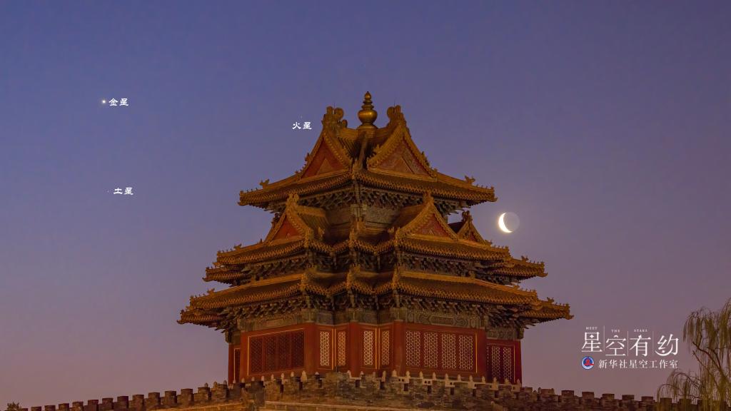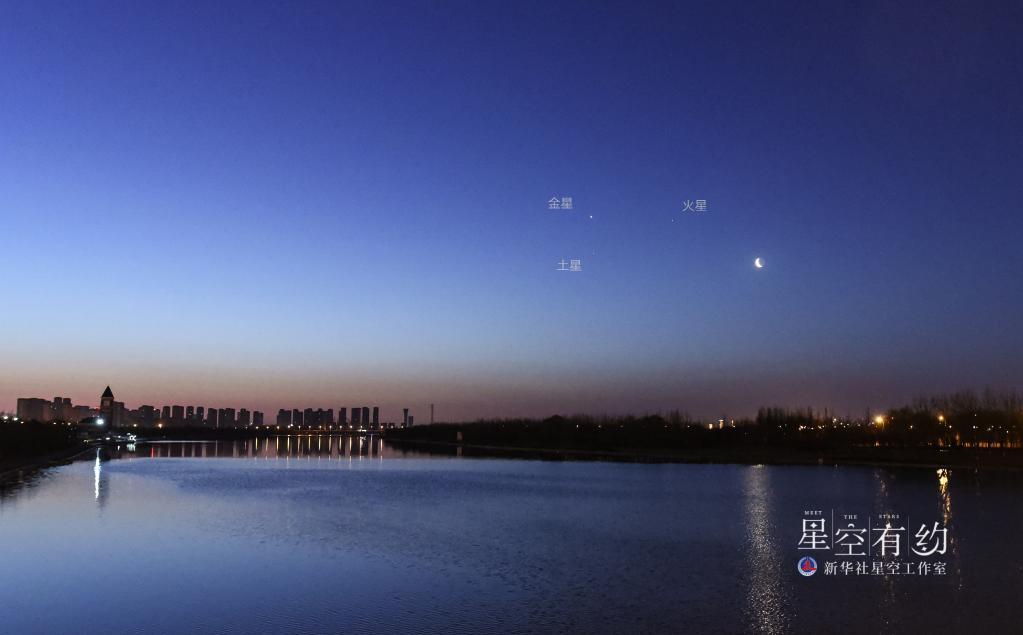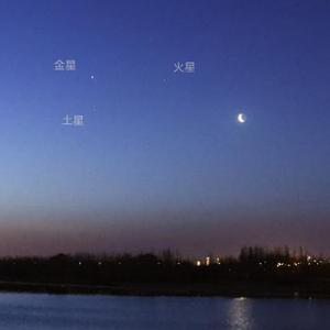 這是天津市天文愛(ài)好者楊婧2022年3月28日清晨在天津拍制的金星、火星、土星與殘月。(本人供圖)