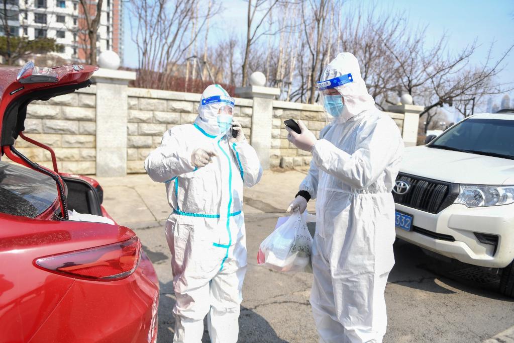 3月21日,在吉林市一小區卡口,志愿者張銳(右)、陳斌打電話(huà)通知社區工作人員取貨。新華社記者 張楠 攝