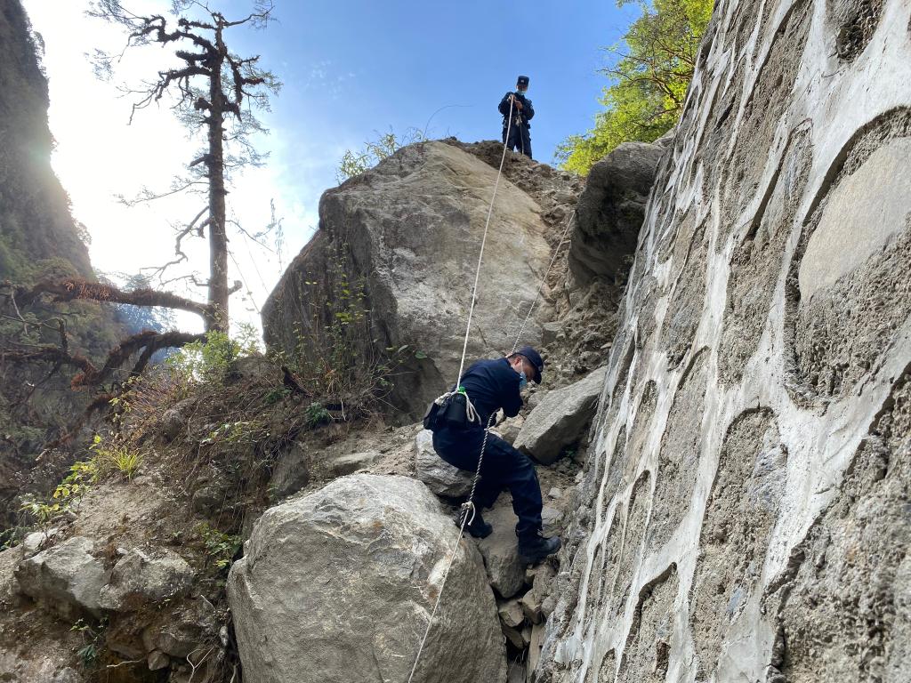 巡邊,是邊境派出所的一項重要日常工作。作為一條東北至西南走向的狹長(cháng)溝谷,這里山脈高峻,溝壑縱橫,巡邊線(xiàn)路大多位于山間,腳下亂石叢生,兩側則是懸崖峭壁和飛流澗瀑,有的路段還需要在山崖固定繩索,手腳并用攀爬前行。
