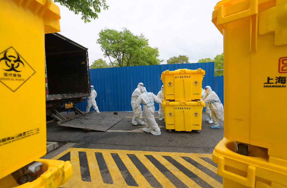 ↑4月30日,上海環(huán)境集團工作人員在上海市仁濟醫院南院區(新冠定點(diǎn)醫院)收集醫廢。