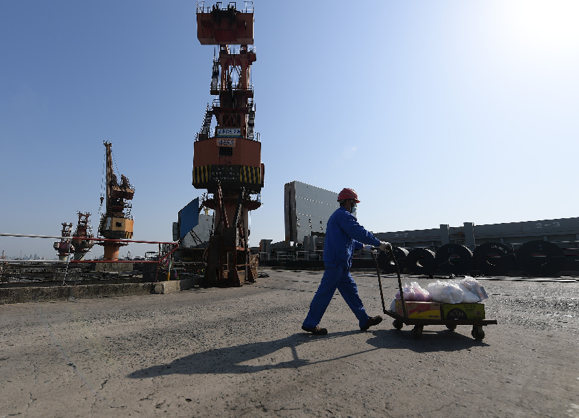 ↑4月11日,楊浦區海保碼頭工作人員在作業(yè)區幫忙轉運訂單貨物。當日,因封控措施被困碼頭的船主張同華向商家訂購了食物,但因為碼頭的防疫規定無(wú)法交接,了解情況后,碼頭管理者與配送人員接力,將訂單貨物送到張同華手中。