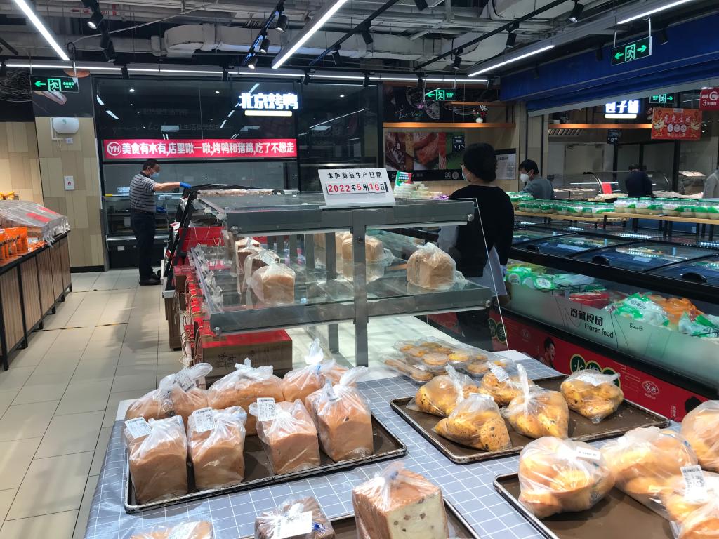 5月16日,位于徐匯區的永輝超市華涇龍湖店正式啟動(dòng)線(xiàn)下?tīng)I業(yè)模式,圖為門(mén)店內當天上新的面包。新華社記者 周蕊 攝