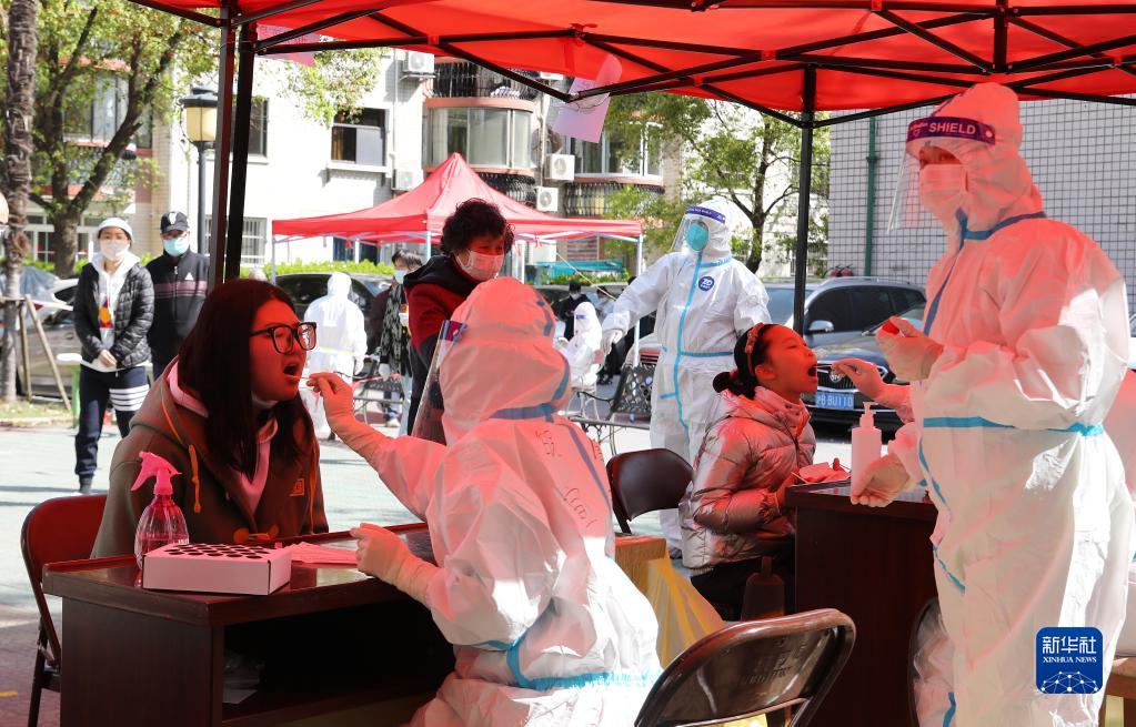 在上海市閔行區七寶鎮一小區內,安徽省援滬醫療隊隊員為居民進(jìn)行核酸檢測采樣(4月4日攝)。新華社記者 方喆 攝