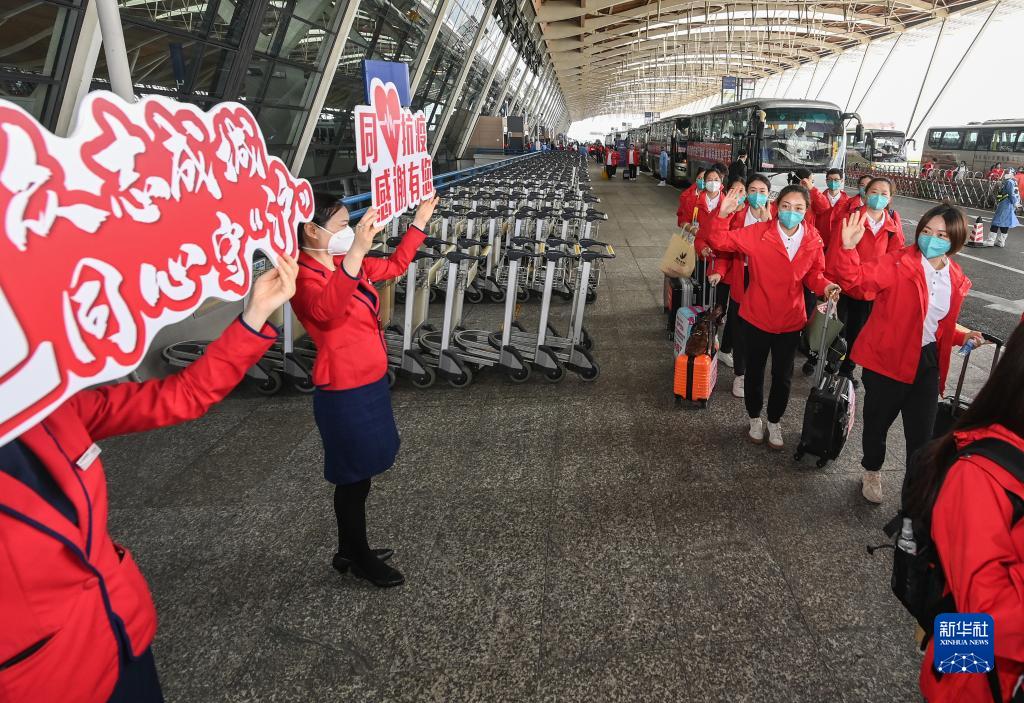 虹橋機場(chǎng)、虹橋高鐵站驟然忙碌起來(lái),全國各地的醫療隊紛紛逆行而至。4月3日,武漢金銀潭醫院援滬醫療隊領(lǐng)隊程芳一下火車(chē),看到很多人前來(lái)迎接,不斷說(shuō)“謝謝”。程芳說(shuō):“上海人不用跟武漢人客氣!”
