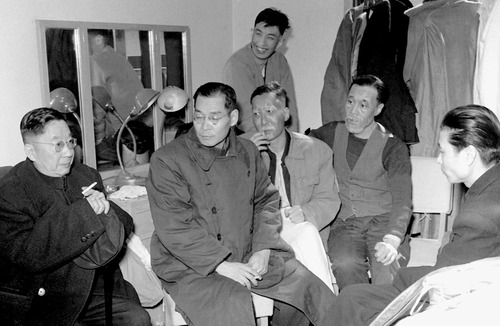 1958年3月,老舍(左一)看完《茶館》彩排之后與導演焦菊隱(左二)、夏淳(右一)和演員于是之(右三)等座談。(資料照片)