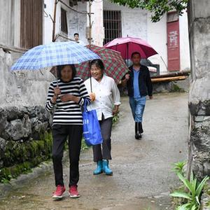 19日下午,天空淅淅瀝瀝下著(zhù)小雨,在安徽省黃山市徽州區呈坎鎮容溪村,村民胡愛(ài)萍和鄰居一起冒雨走出家門(mén),坐上鎮政府安排的汽車(chē),前往楊干集中安置區。