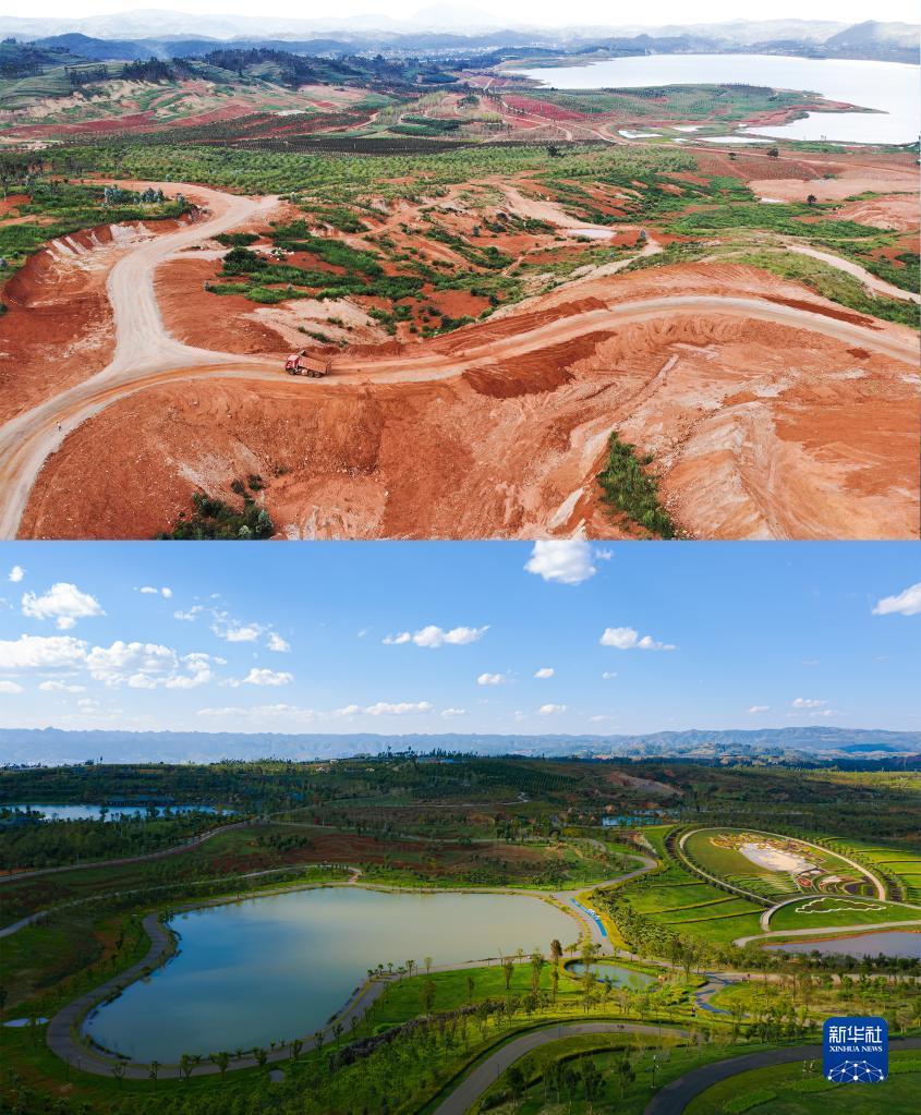 拼版照片:上圖是云南省彌勒市太平湖森林小鎮施工前景象(資料照片);下圖是云南省彌勒市太平湖森林小鎮(無(wú)人機照片,2018年11月10日攝,李昱廷攝)?!⌒氯A社發(fā)