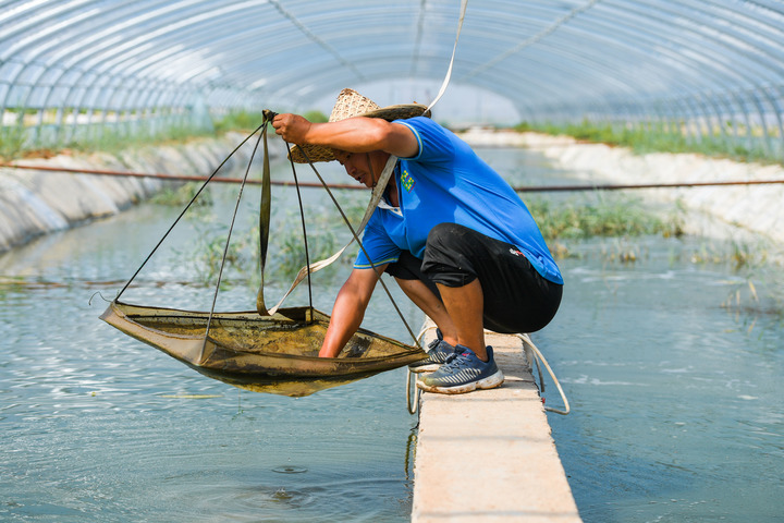 8月25日,在地處黃河岸邊的內蒙古烏海市海南區巴音陶亥鎮的鹽堿水對蝦養殖園區,工作人員在查看對蝦生長(cháng)情況。新華社記者 劉磊 攝