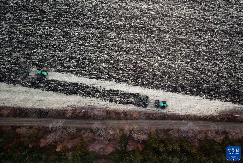 10月19日,在北大荒集團北安分公司趙光農場(chǎng)有限公司一處耕地,農機在進(jìn)行整地作業(yè)(無(wú)人機照片)。新華社記者 王建威 攝