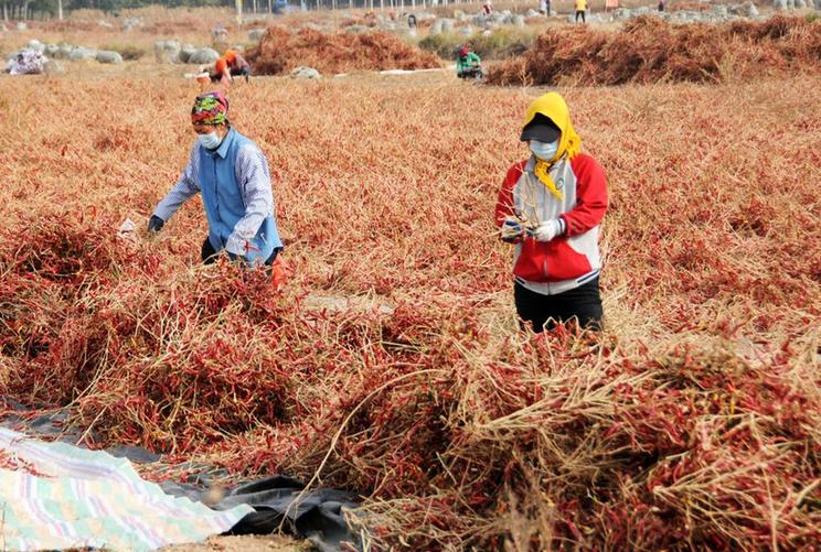 工人在雙河鎮萬(wàn)畝辣椒產(chǎn)業(yè)示范園采摘辣椒。(新華社記者李云平 攝)