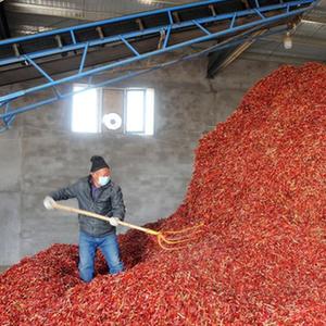 記者在白腦包鎮辣椒加工廠(chǎng)看到,院子中存放著(zhù)一堆堆剛剛收割的辣椒苗,工人將初選好的辣椒投放到廠(chǎng)房中的傳送帶,機器依次完成篩選、色選、烘干等工序,一個(gè)個(gè)完整、光鮮的干辣椒傳送到包裝車(chē)間,最終打包成半成品后進(jìn)行冷藏。