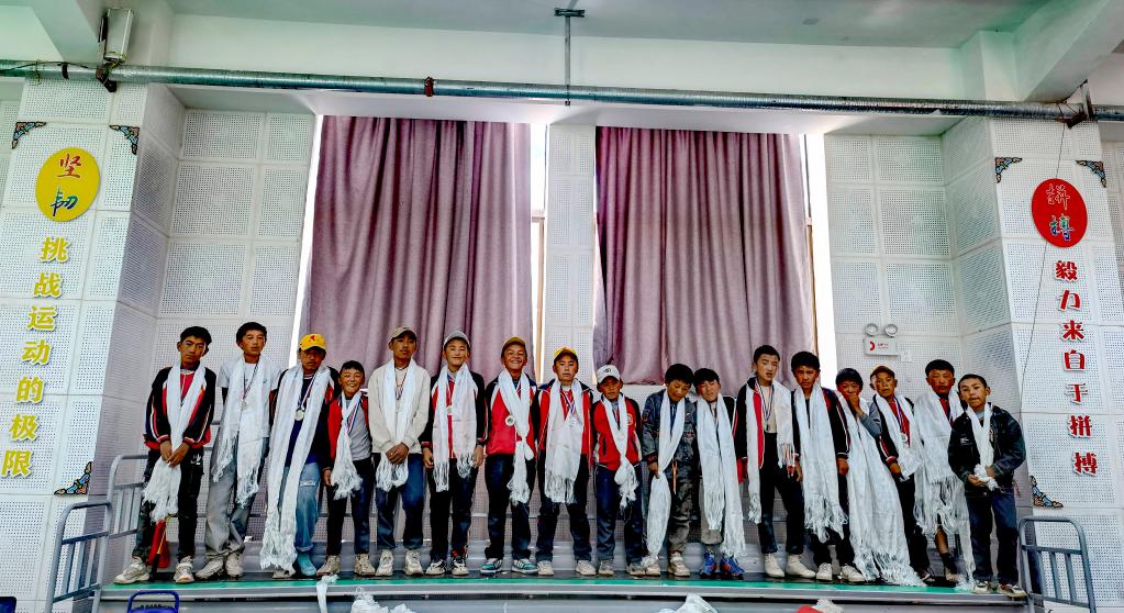 今年6月畢業(yè)前夕,格旦曲桑(前左)和同學(xué)在扎西宗鄉完全小學(xué)的足球場(chǎng)上合影留念