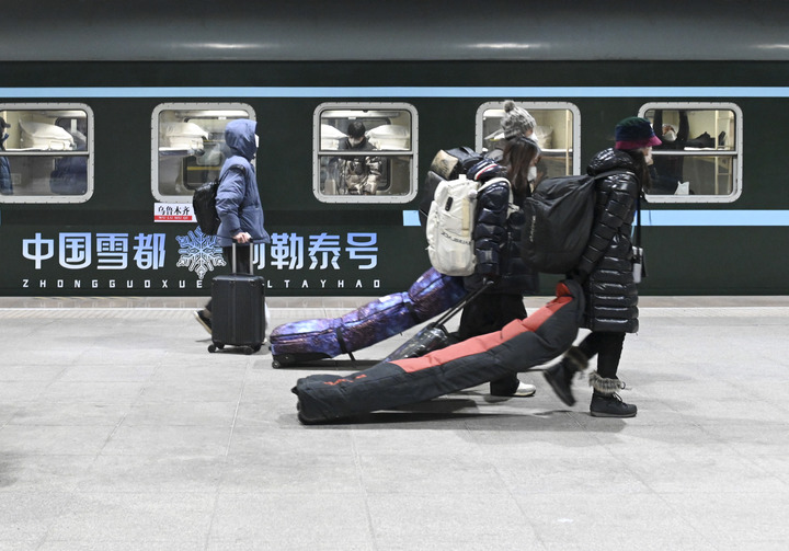 12月28日,在烏魯木齊站,旅客從Y965次“中國雪都·阿勒泰號”冰雪游旅客列車(chē)旁走過(guò)。(新華社記者 郝建偉 攝)