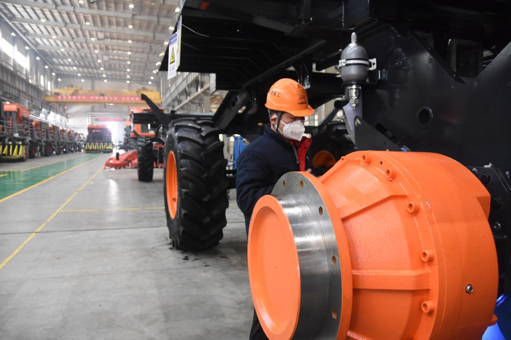 2月2日,鐵建重工新疆有限公司裝配車(chē)間,技術(shù)人員正在裝配農機部件。(新華社記者潘瑩 攝)