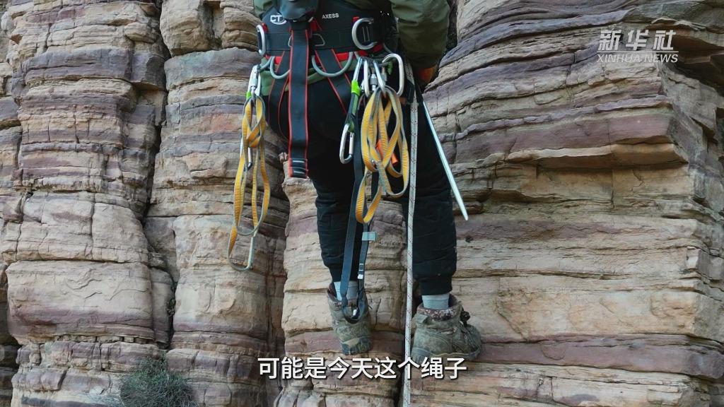 安全保障是兩人最關(guān)注的事,每次下吊前,他們總是要反復確認安全帶和安全繩是否系緊,降速器等裝備是否正常。一人下吊作業(yè),另一人在山頂看護輔助,兩人通過(guò)對講機進(jìn)行交流,默契配合。