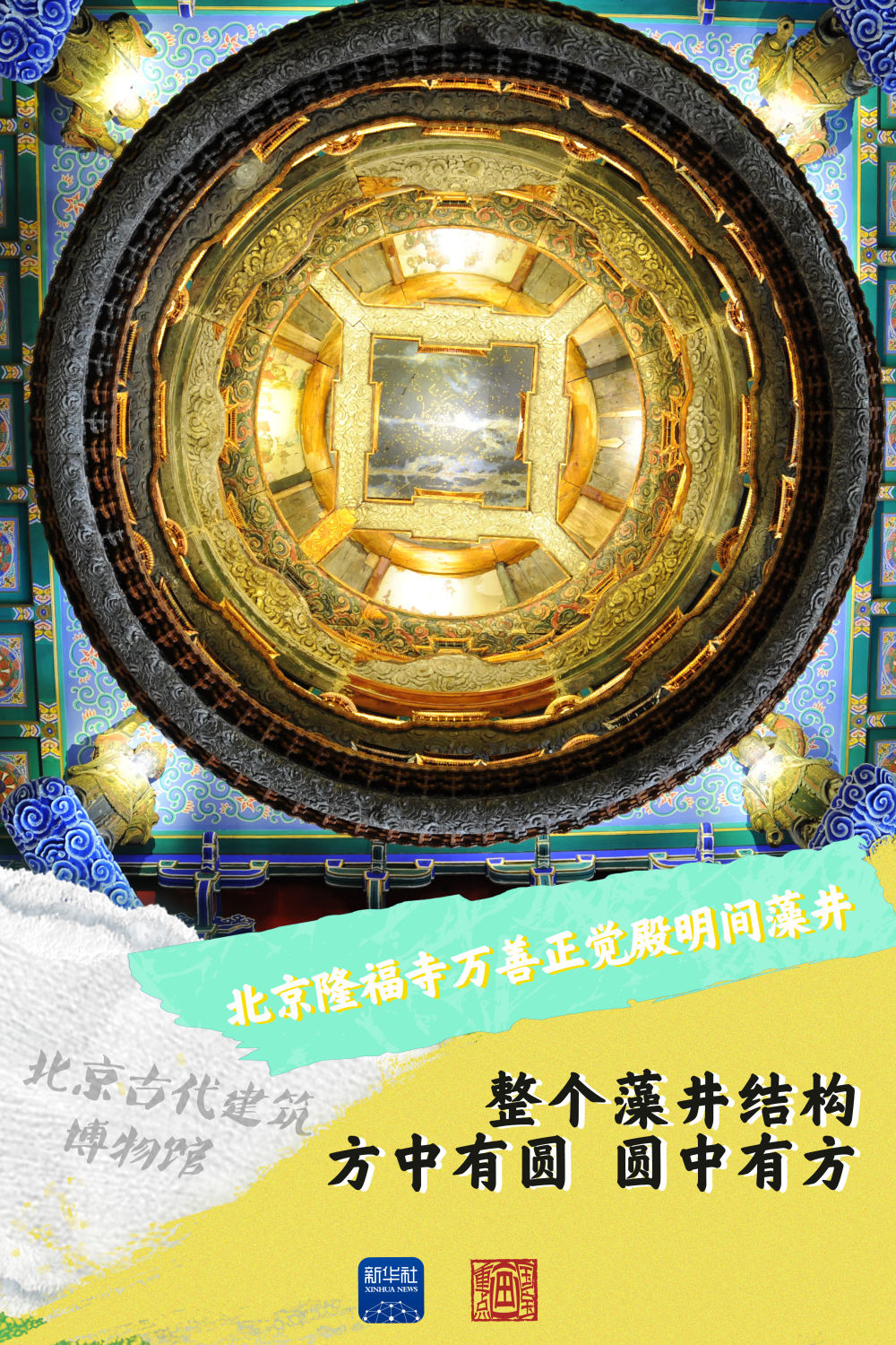 北京古代建筑博物館的鎮館之寶是這座美輪美奐的藻井,整個(gè)藻井的結構為方井內含圓井,圓井內又含方井。藻井四角立力士雕像,意在托起中心圓井。圓井應為六層框架,現存有五層,其中幾層之上布置有天上宮闕。宮闕里有精雕細琢的仙人天女,表情神態(tài)極為細膩。藻井的最上方是一幅星象圖,在燈光照射下宛若星河。