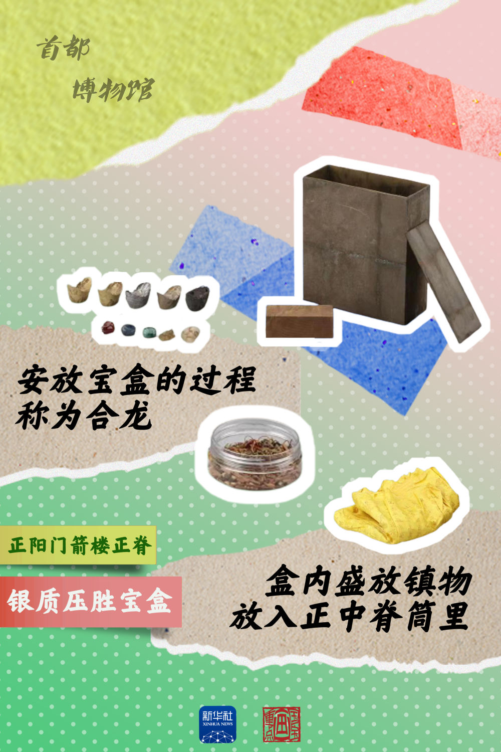 正在北京首都博物館舉行的“輝煌中軸”展覽上,正陽(yáng)門(mén)正脊上銀質(zhì)壓勝寶盒引人注目。這個(gè)從正陽(yáng)門(mén)箭樓正脊取出來(lái)的寶盒,是能代表北京城市營(yíng)造特色的文物之一。壓勝寶盒是規模較大的建筑在修建過(guò)程中,于正脊位置專(zhuān)門(mén)放置的盒子,有趨吉避兇的寓意。