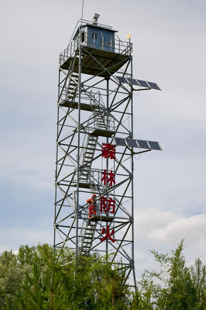 6月5日,臨河區國營(yíng)新華林場(chǎng)護林員登上瞭望塔準備開(kāi)展巡護工作。新華社記者 李志鵬 攝